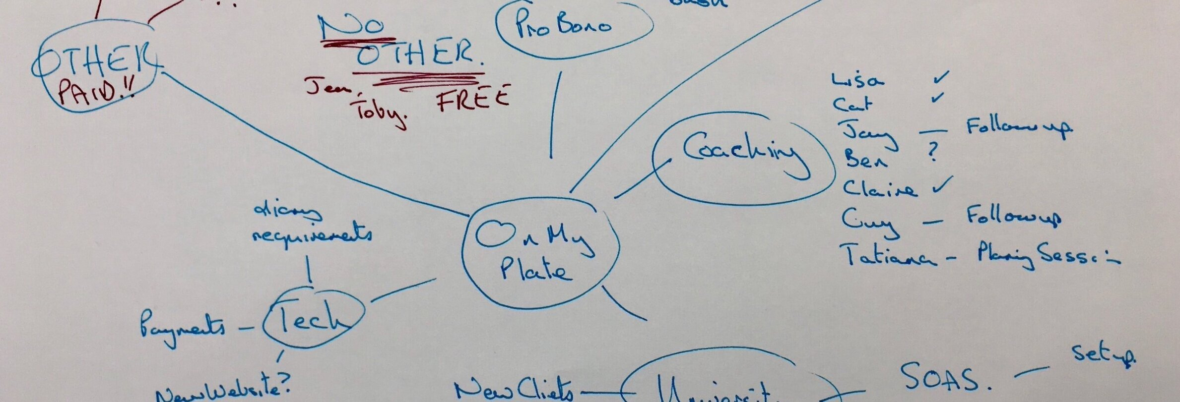So here’s what I do to rescue myself from overwhelm. It’s based on MindMapping, and you can start with just a pen and some scrap A4 paper. I take about two hours, but you can feel the benefits after thirty minutes. It comes in 5 simple steps.
