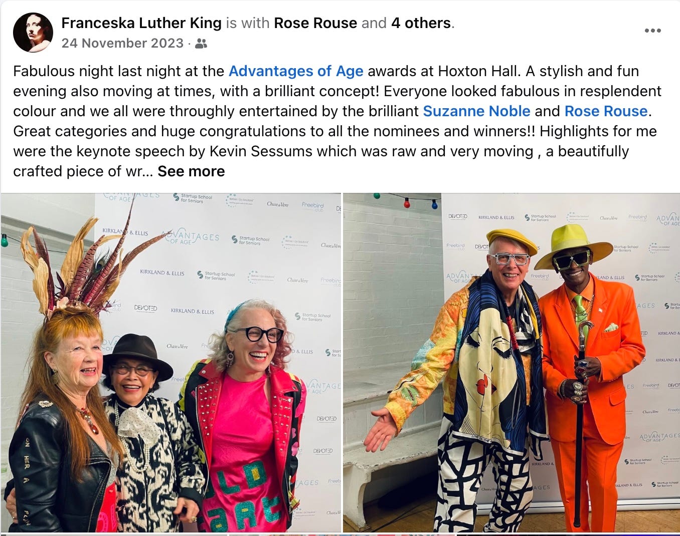 who edits the Advantages of Age Substack and with whom I first started the social enterprise way back in 2016. We created it as a response to the media’s negative narrative around ageing.Among the many activities that have emerged from the organisation, Startup School for Seniors is a standout. We’ve also been fortunate to receive Arts Council funding, which has enabled us to produce films, host cabaret nights, and even hire a double-decker bus. For one memorable event, we invited anyone aged 50+ to come aboard dressed in their most colourful and flamboyant clothes—literally standing out!